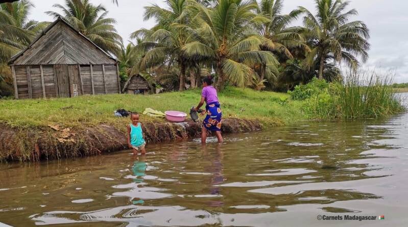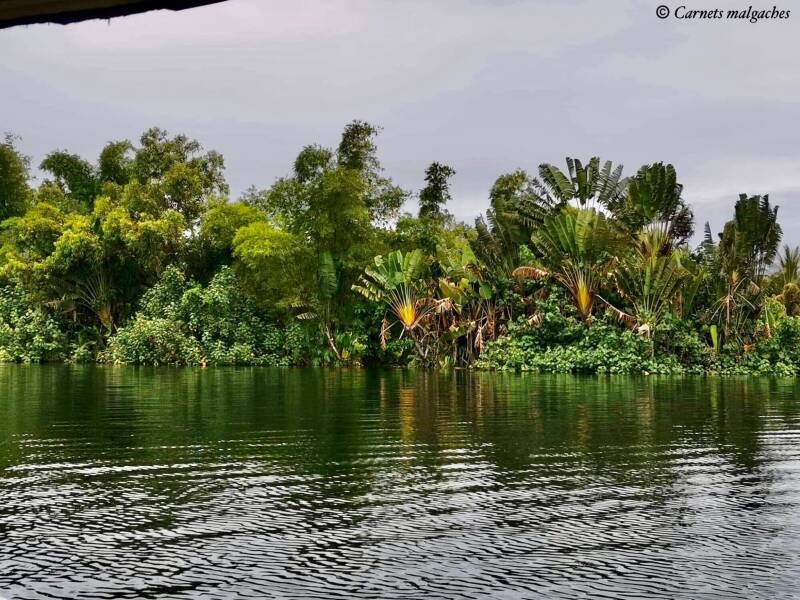 Vu du milieu de cette étendue fluviale, le rivage est magnifique – les villages se succèdent avec leurs jolies cases en « falafa ». Au fur et à mesure que nous avançons, nous voyons défiler sous nos yeux, des paysages magnifiques et surtout cette végétation particulière qui donne tant de charme à cette région : ravinala (arbres du voyageur), pandanus, les oreilles d’éléphants (viha) etc…donnent des touches de couleurs bravant ce ciel gris !